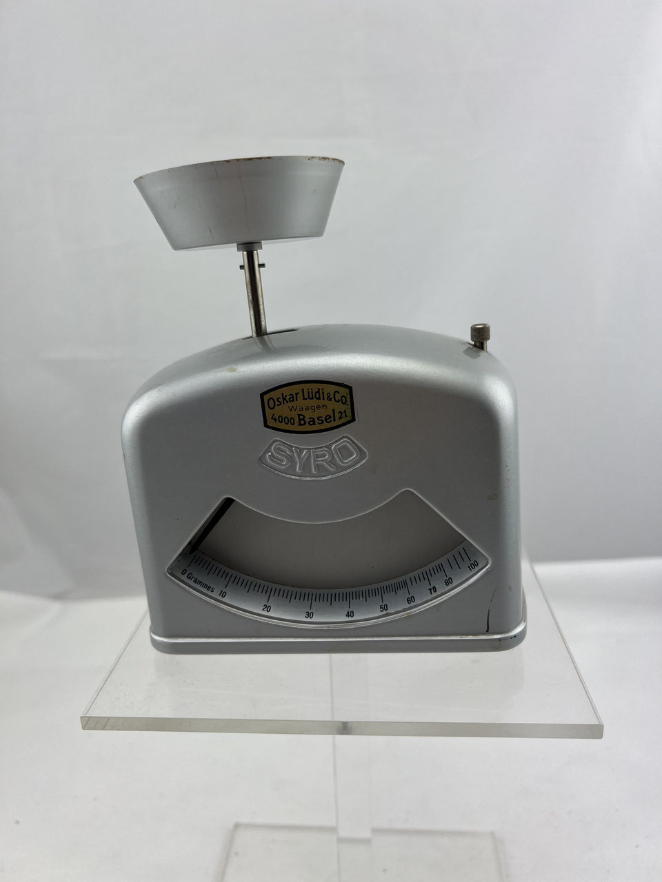 Präzisions-Pendelgewichtwaage. Marke SYRO, 50er-Jahre, Gehäuse aus Leichtmetall. Leichte Ablesbarkeit durch Anzeige der Zwischenwerte. 100 Gramm mit 5er Schritten. Stellschraube für Einstellung. Unempfindlich gegenüber Temperaturschwankungen. Mit Etiikette "Oskar Lüdi & Co., Waagen 4000 Basel 21". Intakter Zustand, jedoch mit einigen Gebrauchssputen und ohne Alu-Becher (Preisreduktion). Gereinigt und geprüft.
